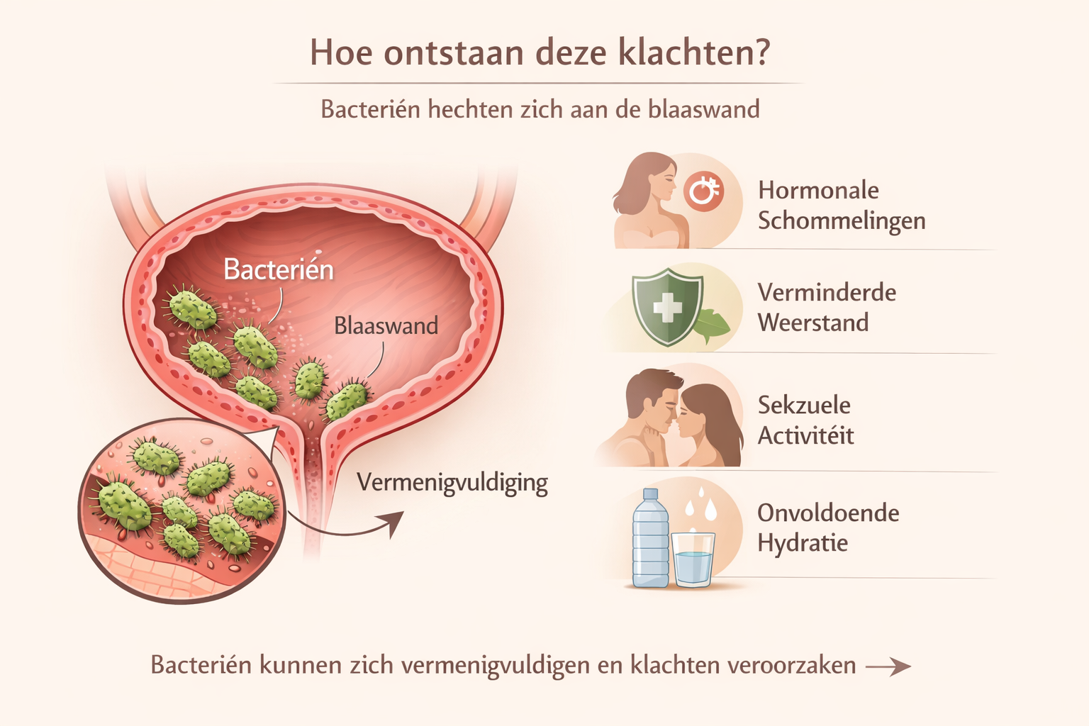 Deze klachten ontstaan meestal doordat bacteriën zich in de urinewegen nestelen en daar irritatie veroorzaken.